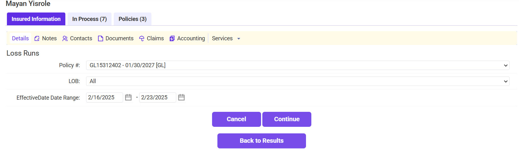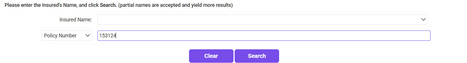 - Enter the insured’s name or policy number >> Click Search.
