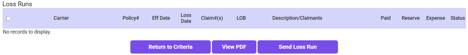 - The Loss Runs will automatically be pulled into EI. If needed, click View PDF to print them, or click Send Loss Run to generate an email with the LRs attached to send them to the agent.
