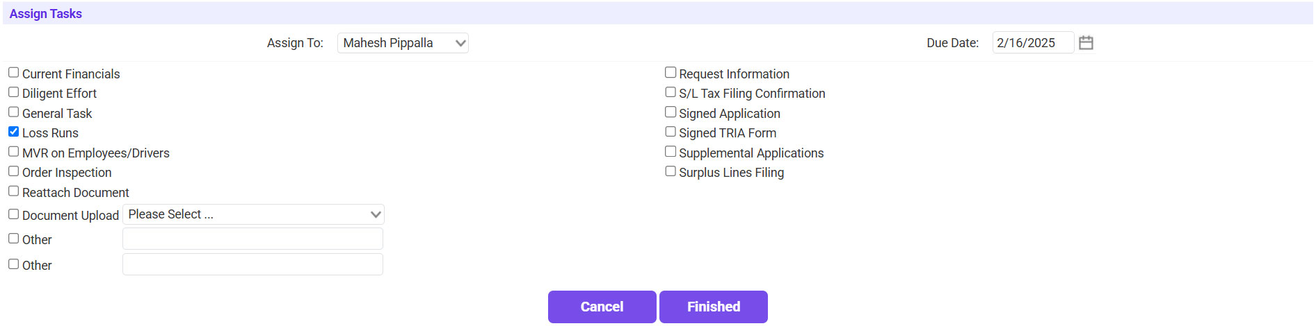 - Check the box next to the applicable task or use the Other option to create a task that is not listed.