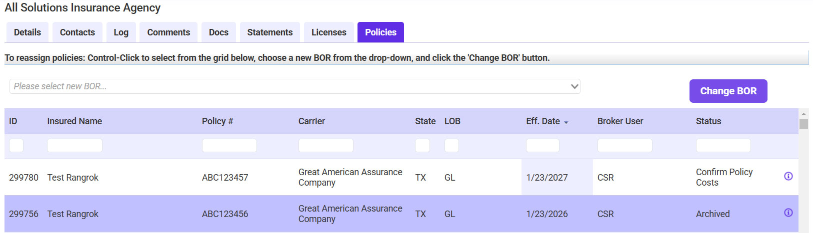 - Select the applicable policy/policies >> Select the new AOR/BOR >> Click Change BOR.